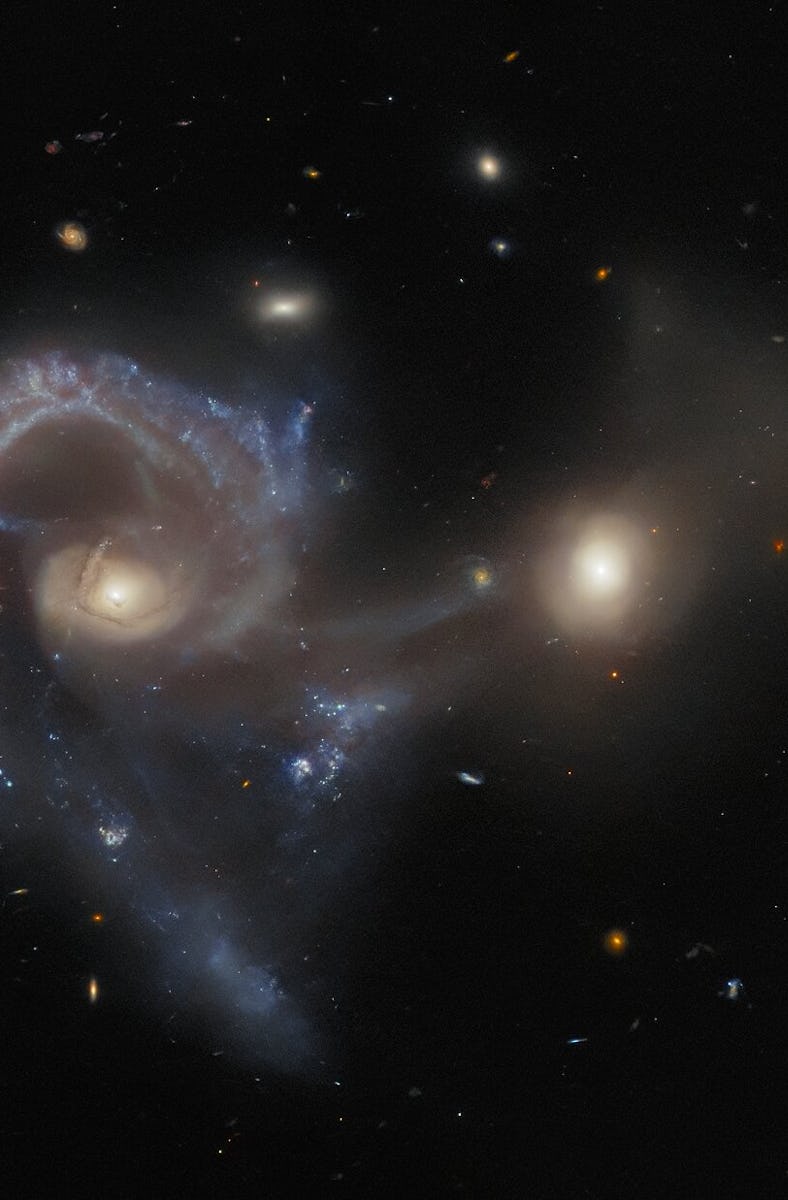 Those distortions are what earn the Arp 107 pair its place in the Arp Atlas of Peculiar Galaxies, a compendium of the 338 weirdest, wildest, wonkiest galaxies in the known universe. The Arp Atlas includes lopsided one-armed spirals, the larger half of Arp 107, galaxies with long, twisting arms like ESO 415-19, and even some ring-shaped galaxies whose previous cosmic dance partners have ripped their hearts out. All of them got their weird shapes in galactic collisions, near-misses, or messy astronomical breakups.