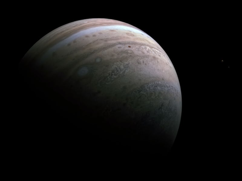 The images were taken during Juno’s January 12 pass around the planet — and while the view of Jupiter is impressive enough, if you squint and zoom in, you can spy two interlopers.