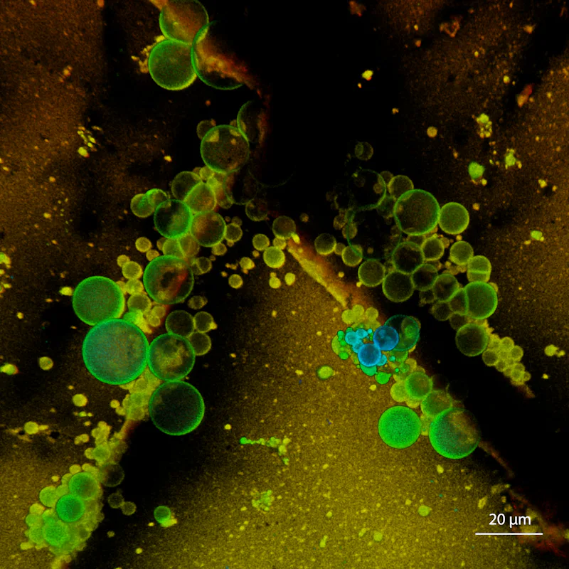 Made of lipids, these spherical clusters would have had a much simpler composition.