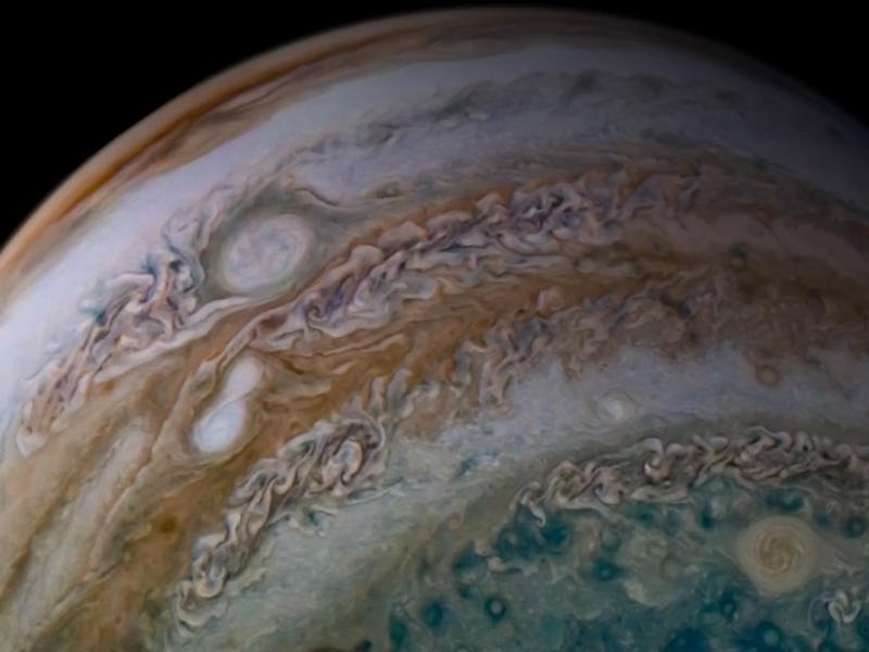 Storm mergers on Jupiter typically occur within a few days — a cosmically short amount of time. As a result, Juno had a pretty narrow window of time to capture this chaotic view. It managed to take the images during the spacecraft's 24th flyby of Jupiter, on December 26, 2019. At the time, the spacecraft was about 44,900 miles (72,200 kilometers) away from the tops of Jupiter's clouds, at a latitude of about 60 degrees South.