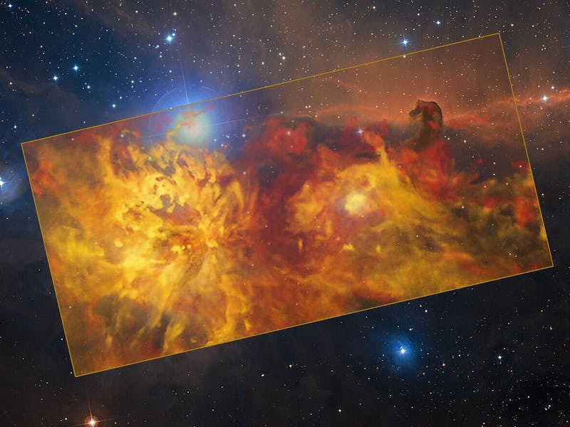 The different colors of the image indicate the velocity of the nebula’s gas. The Flame Nebula and its surroundings are moving away from our perspective on Earth, with the red clouds in the background receding faster than the yellow ones in the foreground.