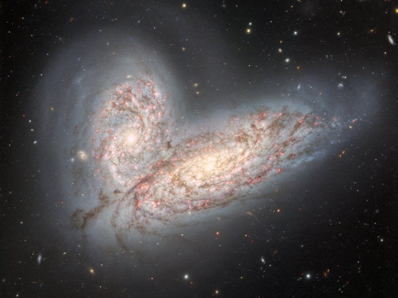 These two merging galaxies are locked in a cosmic death spiral similar to the one that will ensnare our own corner of the cosmos in a few billion years.