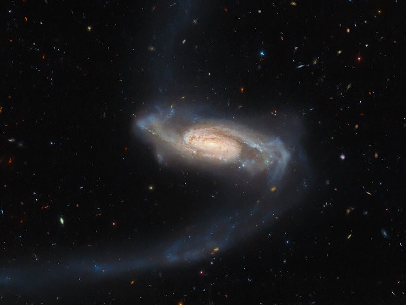 The long curving arms reaching out into space from the spiral of ESO 415-19 are called tidal streams, and they’re the product of interaction with another galaxy, when gravity pulled material from ESO 415-19 outward. Also, ESO 415-19 has been through a lot and needs a hug.