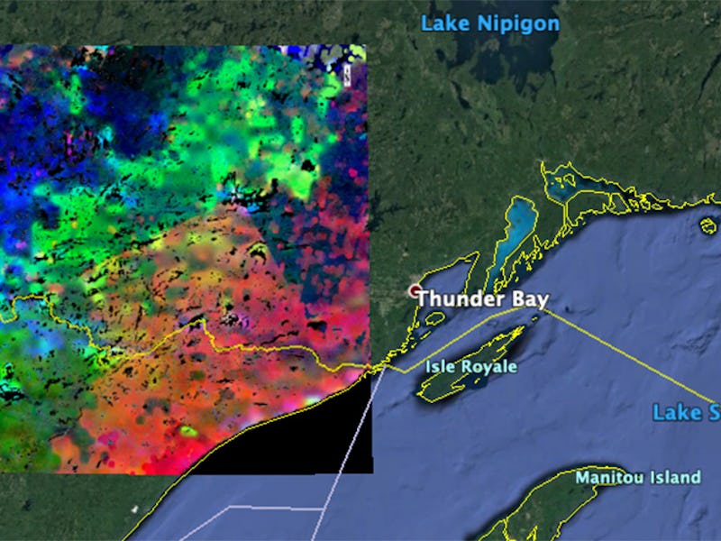 NASA's ECOsystem Spaceborne Thermal Radiometer on Space Station (ECOSTRESS) captured an aerial view of a group of plants west of Lake Superior, which lies near the Canadian-United States borders, that reveals them waking up at different times.