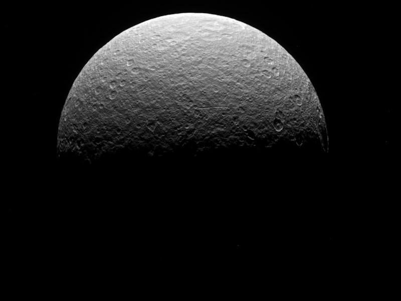 Rhea is a cold, harsh world. Its temperatures range from -281 degrees Fahrenheit on sunlit areas, to -364 degrees Fahrenheit on its dark side. In keeping with the cool temperatures, the moon is largely made up of water ice.