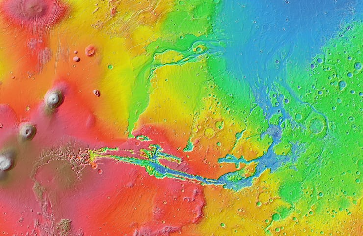 Valles Marineris seen in a color-coded topographic view as if from 5,000 km (3,107 miles) above the surface (left), and imaged by the High Resolution Stereo Camera on ESA's Mars Express (right).