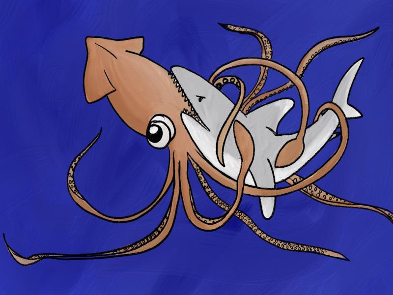 Now, for the first time, scientists have evidence of a large cephalopod tangling with a shark. The shark survived, though not unscathed. This finding was published in June in the Journal of Fish Biology.