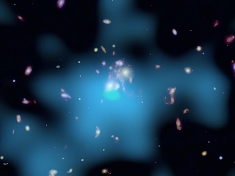 Further observations by Chandra revealed that while the temperature of gas in most of the galaxy cluster is about 65 million degrees, it is much denser and cooler about 80,000 light-years away from the center of SpARCS1049. That region is where the majority of the intense star formation is happening since stars require cooler gas in order to be born as the gas becomes molecular and its atoms can bind together.