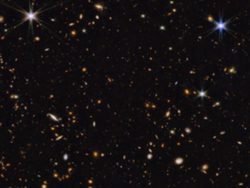“To catch a glimpse of very rare galaxies at the dawn of cosmic time, we need deep imaging over a large area,” says Space Telescope Science Institute (STScI) astronomer Anton Kaekemoer in a recent statement. The faintest, oldest, farthest-away galaxies in this image are about a billion times fainter than the unaided human eye can see, going back to just 300,000 years after the Big Bang. Technically, Webb’s operators describe that as “medium-deep,” which may actually be the ultimate humblebrag.