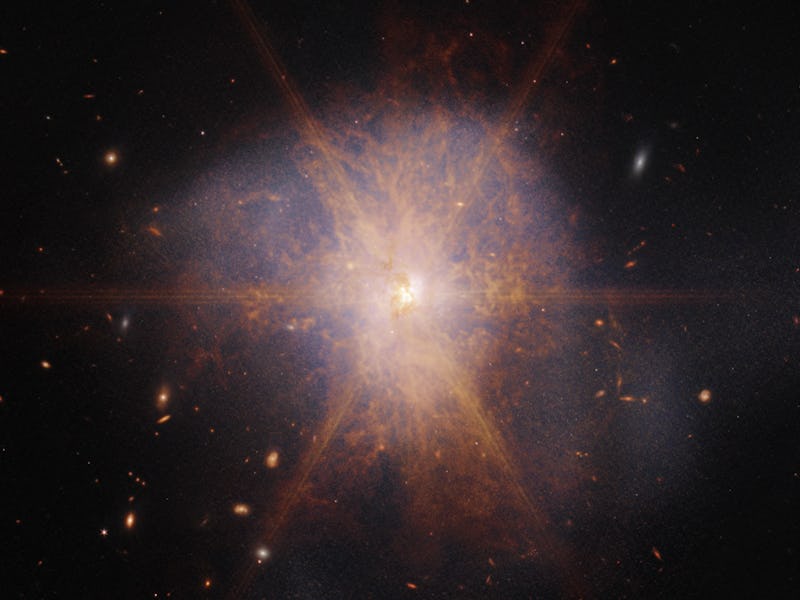 Galaxies are a work in progress, evolving over time and shedding some features while sculpting all new ones. In the case of the two spiral galaxies in the scene dubbed Arp 220, their gas is transforming into a bountiful collection of stars. But that’s because the galaxies have entered a perilous situation, where they’ve crashed into one another. Astronomers think they began colliding 700 million years ago, and now, their cores are a teensy 1,200 light years apart. For reference, the Milky Way and the Andromeda galaxy are separated by a 2.5 million-light-year stretch of space.