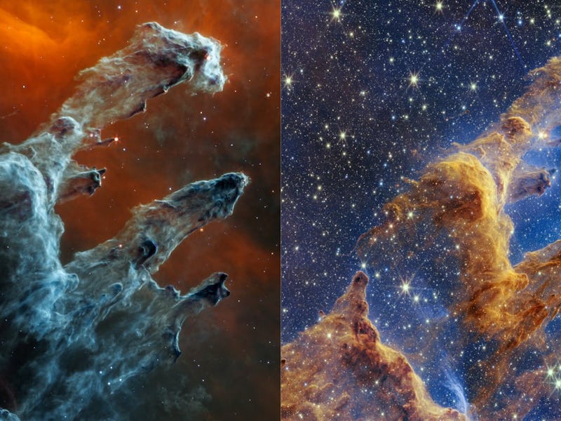 Left: The NASA/ESA/CSA James Webb Space Telescope (JWST) mid-infrared view of the Pillars of Creation. Right: JWST’s near-infrared-light view.