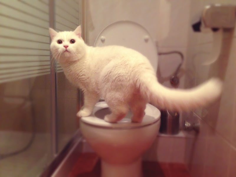 Cat instincts also program a certain set of behaviors with going to the bathroom that the toilet eliminates. “They like to bury whatever they produce,” Ellis says. “The minute you put a little kitten on a surface that's very soft and rackable, that instinct just kicks in, and they'll start digging.” This behavior comes from generations of cats trying to cover their tracks from potential predators, as well as other cats from parasites in their waste. Ellis says that some cats might even try to dip their paws in the water to finish their business.