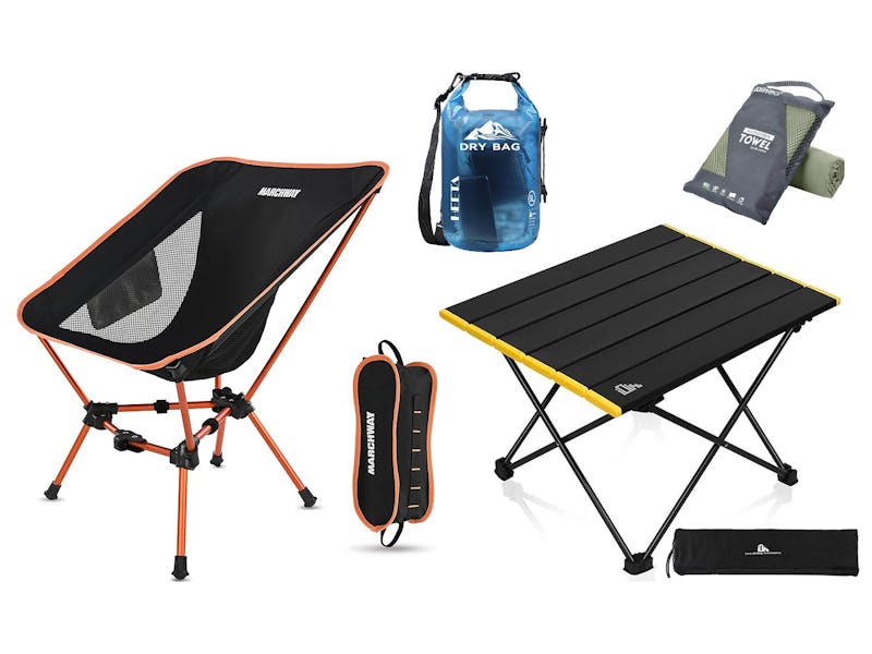 The MARCHWAY lightweight folding camping chair is a stable and compact chair designed for various outdoor activities. Weighing only 2.7 pounds and supporting up to 330 lbs, it features a triangular aluminum frame for enhanced stability and durability. The chair is easy to set up and fold away, making it ideal for camping, hiking, picnicking, and travel.