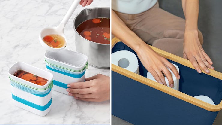 These clever plastic molds allow you to make sure food freezes in uniform blocks, so they’ll take up less space in the freezer. To use — add your food-filled quart bag to the mold, secure the silicone bands, freeze, and then remove the mold. The resulting frozen blocks save serious space, and they look so much tidier than a jumble of containers.