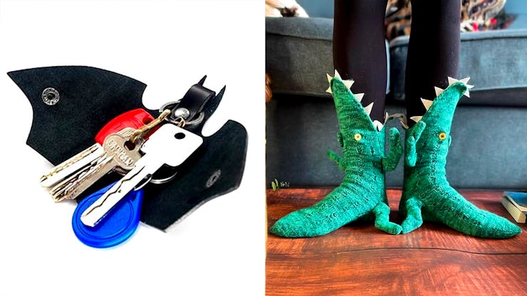 These wildly fun knit socks look like you’re being eaten alive by a dinosaur — but in a cozy way. With textured stitching, bulging eyes, and adorable little arms and teeth, the socks are a hilarious mix of comfort and chaos. The stretchy, one-size design fits most (US sizes 5 to 11), and the plush knit keeps your feet warm while making you smile. You can also get the socks in several other animal designs.